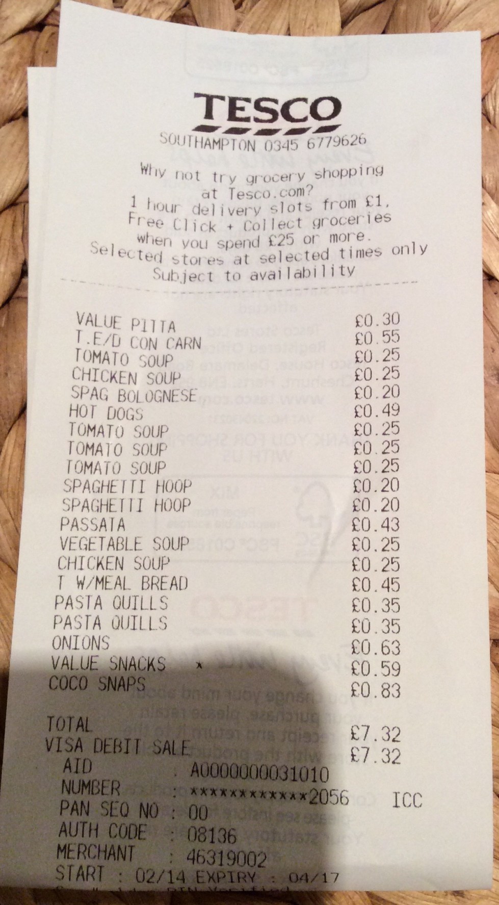 I’ve hatched a plan using Tesco online to ensure my ingredients come in under £7. Grand ideas of fresh veg are quickly quashed as it’s just too expensive, I quickly learn that tins are the way forward.