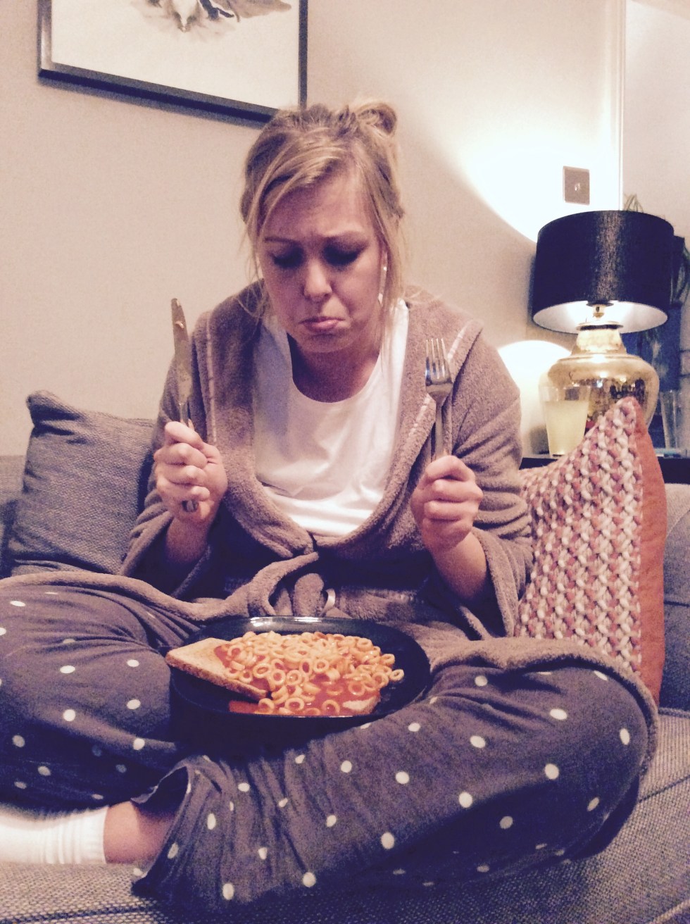 It’s been so long since I made this that I forget to heat up the hoops and pour them on the toast cold! Argh! It’s a bleak combination but I can’t be bothered to get up off the sofa, so I plough on through. It’s missing the obligatory student bottle of white lightning but I polish it off like a trooper.