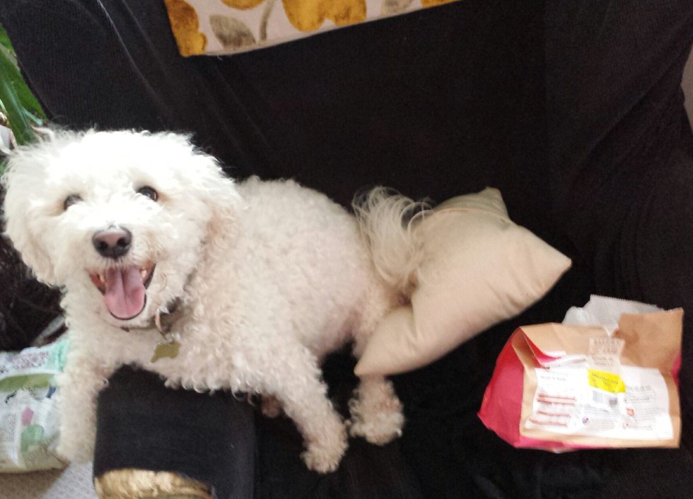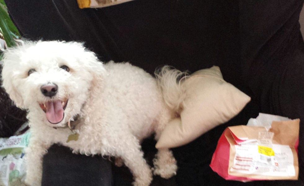 “Dexter” as he’s known locally has white curly hair is approximately 1 foot tall and is 35 (in dog years). A notorious dog burglar, if found I advise you approach this devious treat thief with caution as he has been known to slobber and has previously served time for puddle making.