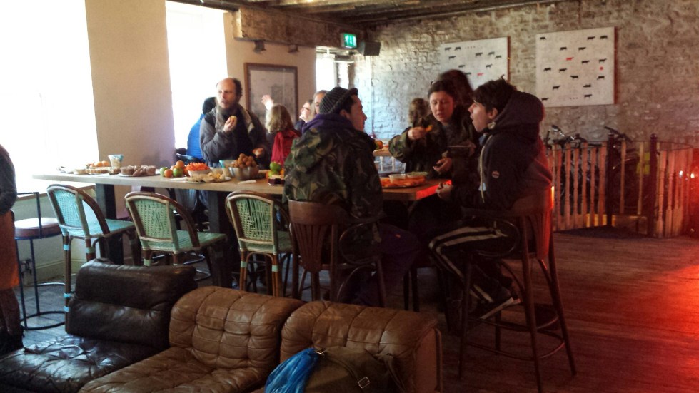 The pay as you feel policy means Skipchen’s clientele are an incredibly broad church. In one corner there are some folk with dreads and tie-dye clutching guitars and on another table there is a lady in a fur hat eating blueberries as a big issue seller weaves around collecting pastries. My friends and I sit down to enjoy some of the table nibbles with a homeless guy called Robbie, who it turns out knows a lot about the cheese we are eating, its process and origins! An older lady eating alone comes over to join us and opines loudly to us all on the merits of corn beef. It’s an eclectic company but a very merry one.