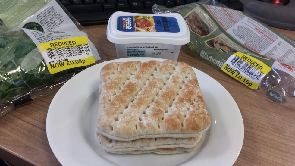 I’m feeling somewhat saturated by four days of skeleton soup, there’s only so much of it you can take and so decide to freeze the remainder for a rainy day. Whoopsie aisle wins in the form of a reduced pack of warburton thins and a bag of watercress, rocket and spinach make for a more exciting lunch over the next two days when paired with a Brussels pate (60p) from Tesco.