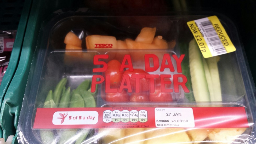 This little packet caught my eye today, it claims to offer the diner ‘five a day’ all in one pack. If a little patronising, it appeals to those seeking a simple, quick and convenient solution to ticking the five a day box. However at £3 for 400g of a few cucumber sticks, melon, pineapple chunks, tomatoes and beans it probably wouldn’t fill a rabbit up! Even at the reduced price it still blows my budget out of the water. It is a good example of a) the price of fresh food and b) the premium we can pay for convenience.