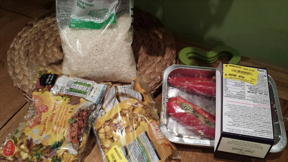 I leave the studio at 7.30pm- just in time for reduction prime time. I make tracks towards the green mecca for bargain hunters that is the Asda whoopsie aisle! The little yellow “whoops!” stickers guide me in like runway lights and I’ve landed a jumbo deal in the form of stuffed Romano peppers for 20 pence.