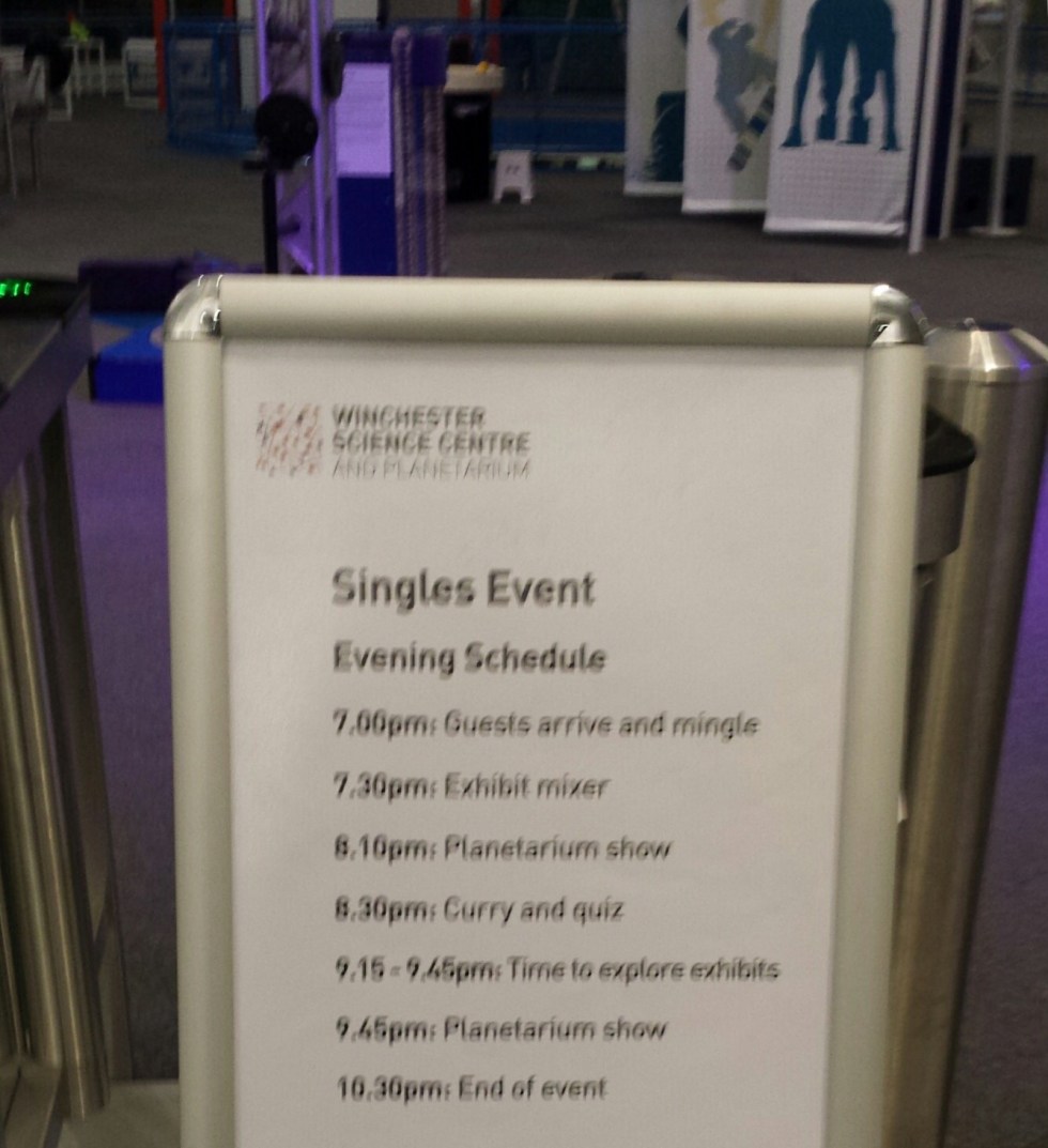 I am going boldly where I’ve never gone before -to singles night at Winchester planetarium. I am sure you’re now picturing a room full of trekkies, as am I. However for your information your future wife is secretly intrigued by space shizzle and is a bit of a Red Dwarf fan on the quiet. So I thought why the smeg not.